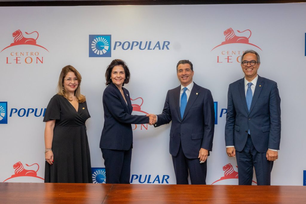 El acto de firma tuvo lugar en la Torre Popular, encabezado por los señores Christopher Paniagua, presidente ejecutivo del Banco Popular y María Amalia León, presidente de la Fundación Eduardo León Jimenes y directora general del Centro León.