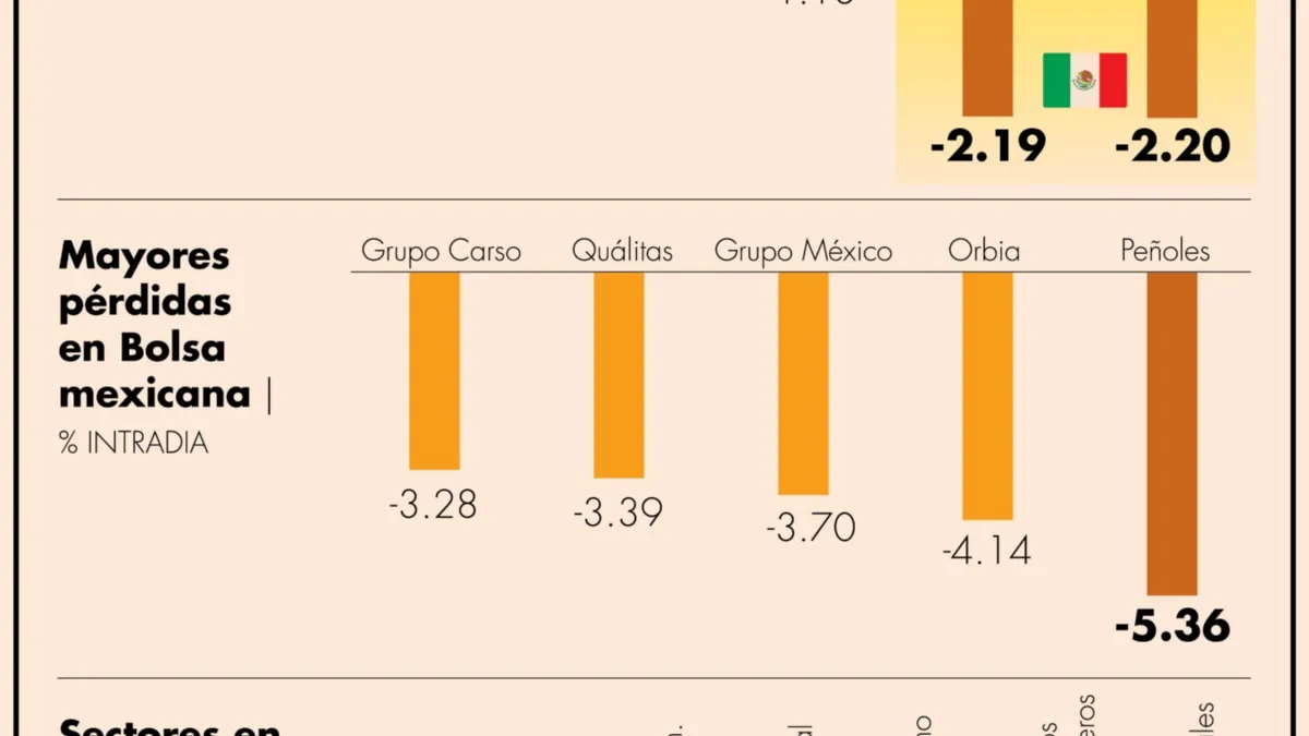 Las caídas más profundas las registraron la minera Industrias Peñoles (-5.36%), la química Orbia (-4.14%), el conglomerado Grupo México (3.70%), así como la aseguradora Quálitas (-3.39%) y Grupo Carso (-3.28%).