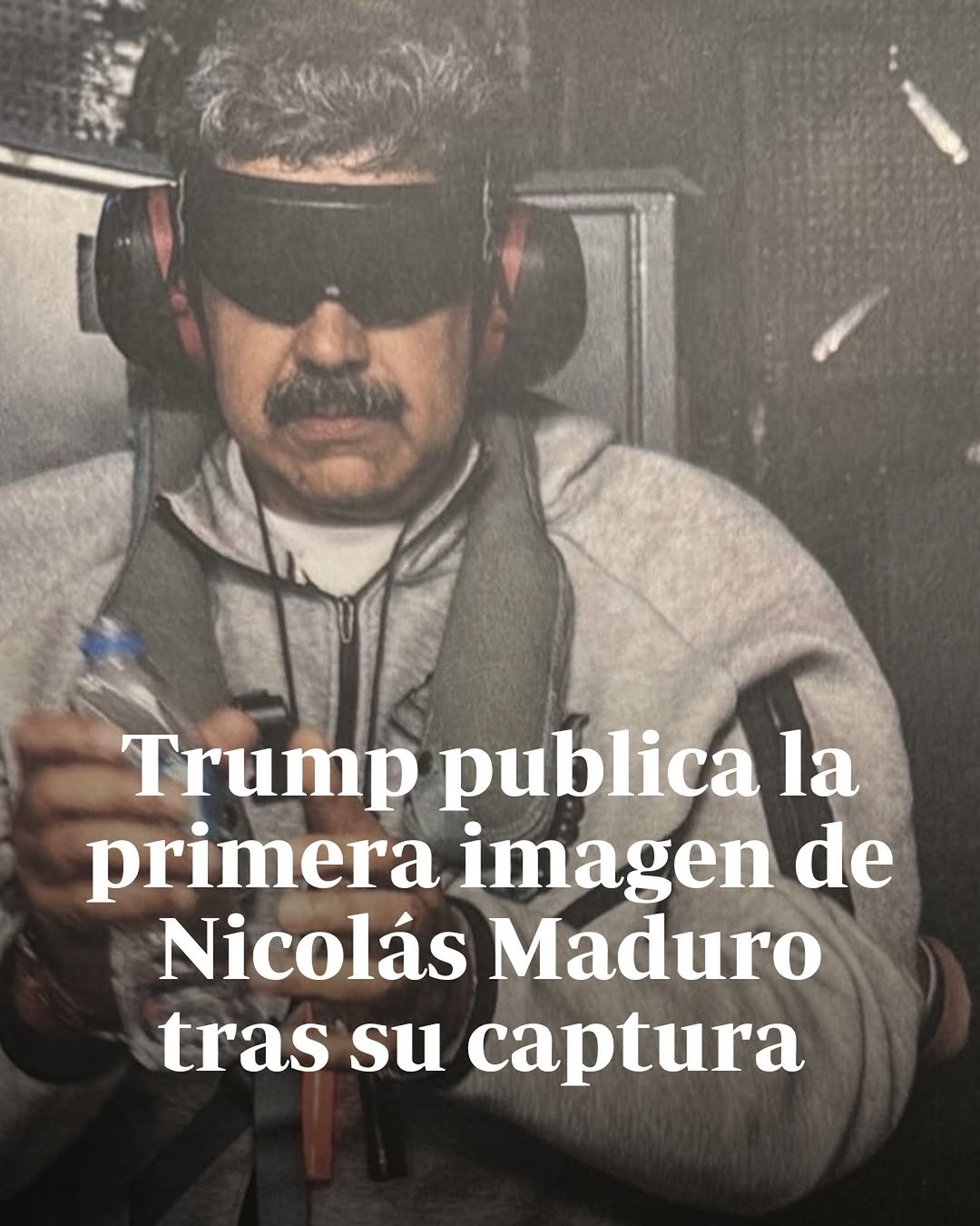 En la imagen difundida por Trump bajo el título «Nicolás Maduro a bordo del USS Iwo Jima», se observa al presidente venezolano con los ojos cubiertos, unos auriculares en los oídos y sosteniendo una botella de agua. A la izquierda de Maduro se distingue el brazo y parte del cuerpo de uno de los guardias que lo sujeta, con las iniciales de la Agencia Antidroga de Estados Unidos (DEA) impresas en el uniforme, mientras el mandatario aparece serio e inmóvil.