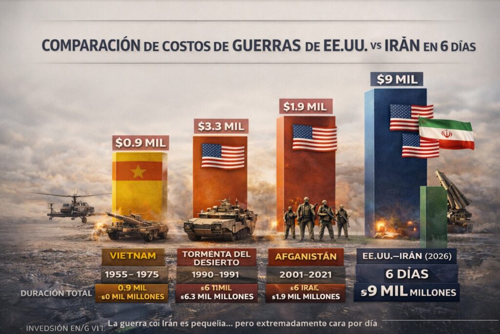 | Conflicto EE. UU.–Irán (2026) | 6 días | US$7B – US$9B | US$1B x día | Guerra tecnológica de alta intensidad basada en misiles, drones y defensa antimisiles |