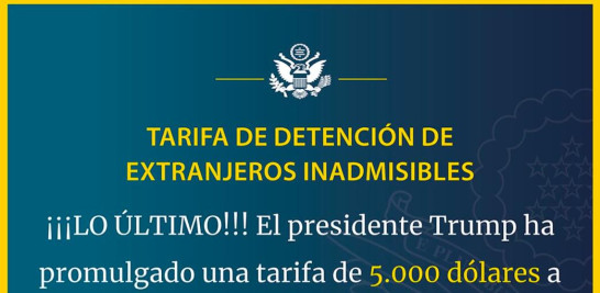 ¡LO ÚLTIMO! El presidente Trump promulgó una tarifa de 5,000 dólares a la detención de extranjeros inadmisibles, que se aplicará a cualquier extranjero de 14 años o más que ingrese ilegalmente a Estados Unidos. Esta tarifa es definitiva, no negociable y no puede ser apelada. El incumplimiento en el pago resultará en consecuencias financieras adicionales”, expresó la embajada en un breve comunicado, publicado en sus redes sociales.