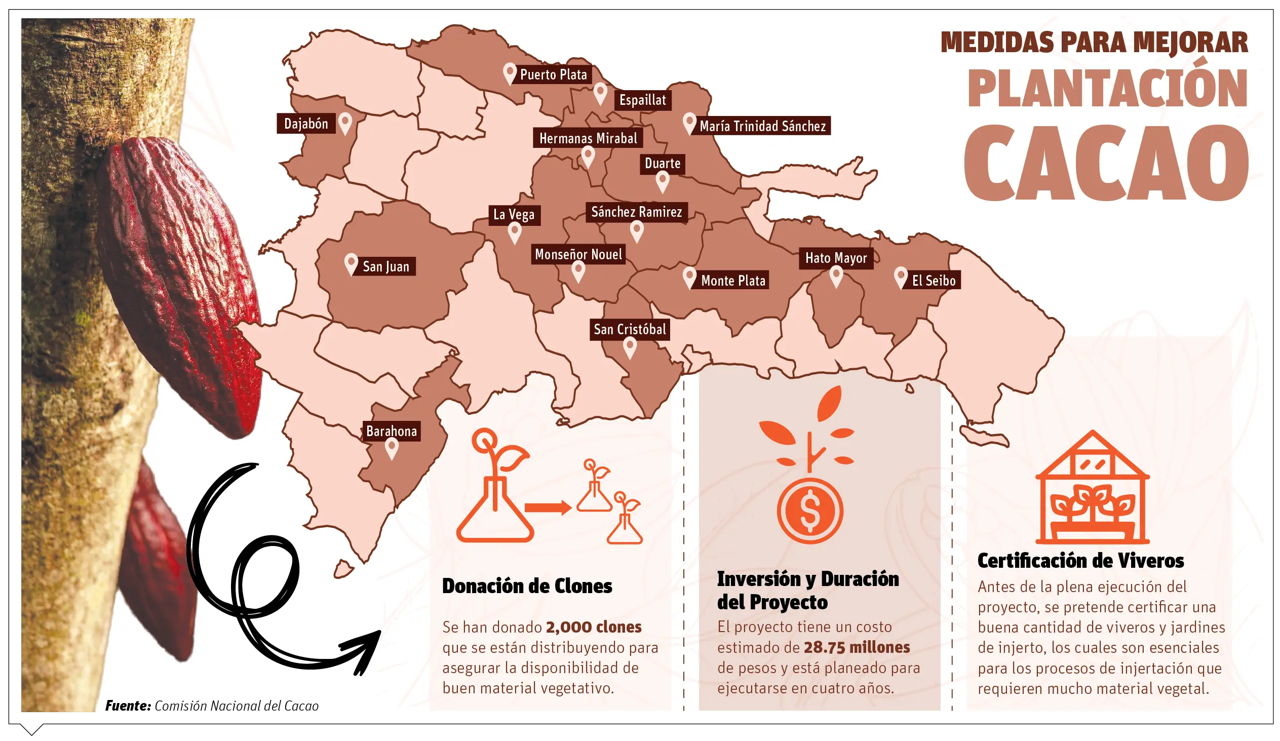 El Gobierno, a través de la Comisión Nacional de Cacao, está desarrollando un proyecto a largo plazo que incluye la certificación de plantas de alta calidad genética y la renovación del 80 % de las siembras actuales, que cubren aproximadamente 2.5 millones de tareas.