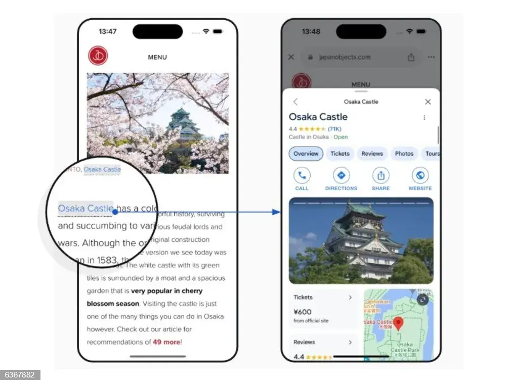 Por ejemplo, si la persona está leyendo un artículo sobre el Castillo de Osaka (Japón), Google incorporará una url en el nombre de este monumento y, al pulsarlo, ampliará su información en una ventana emergente sobre esta página web de terceros. Esto significa que no es necesario cambiar de sitio web, sino que el contenido propuesto por la anotación se puede cerrar en cualquier momento y es posible volver a la página que se estaba visualizando entonces.