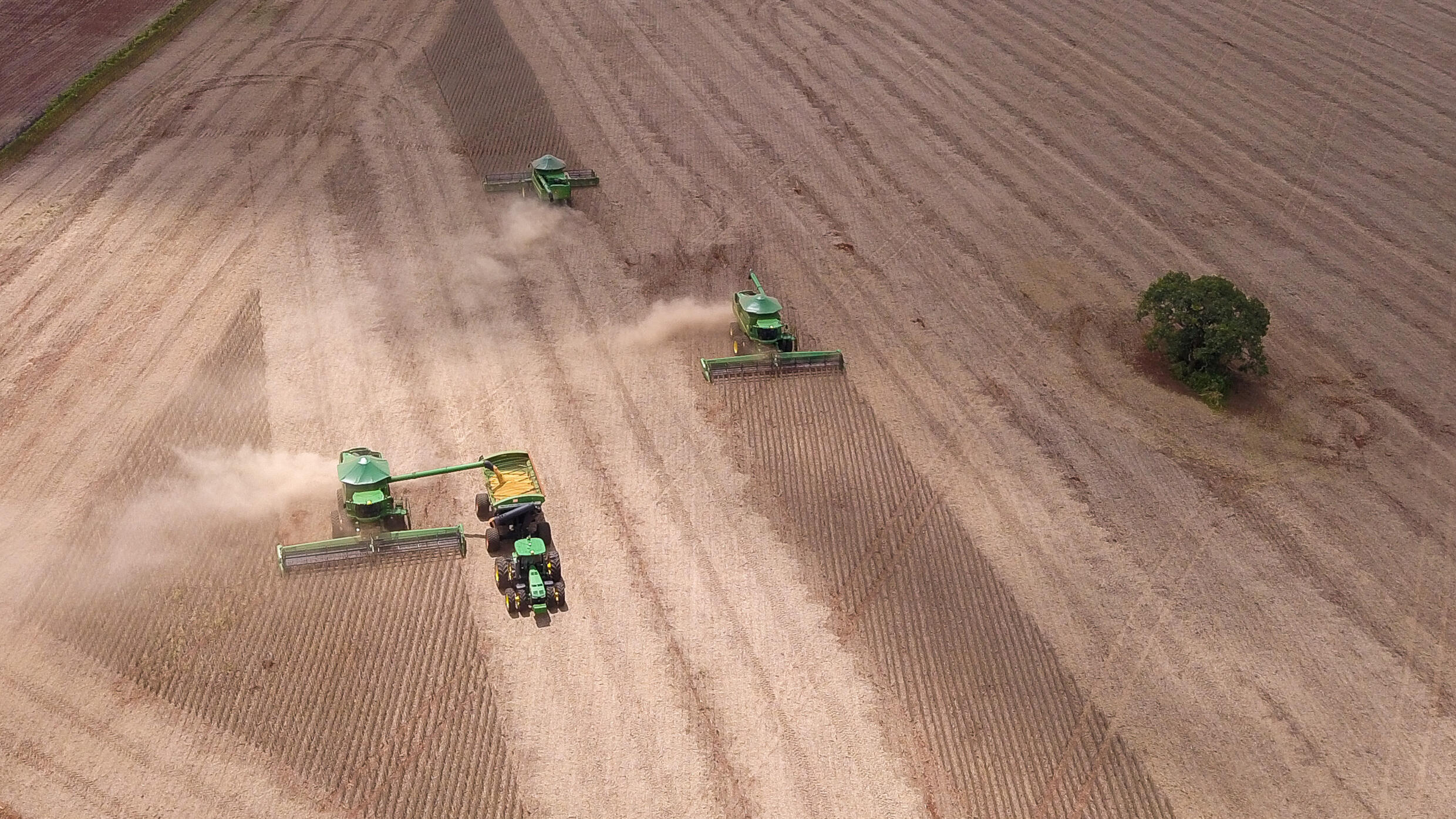 Mientras las segadoras terminan de recolectar la soja en una parcela, Adriano Cruvinel supervisa otro sector de su finca en el centro de Brasil, donde pronto la siembra estará lista para la cosecha.