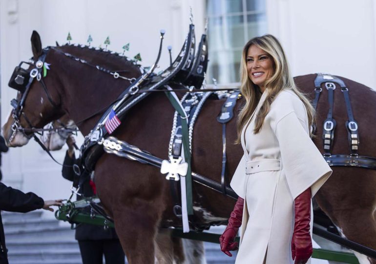 Melania salió a la entrada principal de la mansión a recibir al abeto, que fue transportado por un carro de caballos capitaneado por tres hombres vestidos de esmoquin.