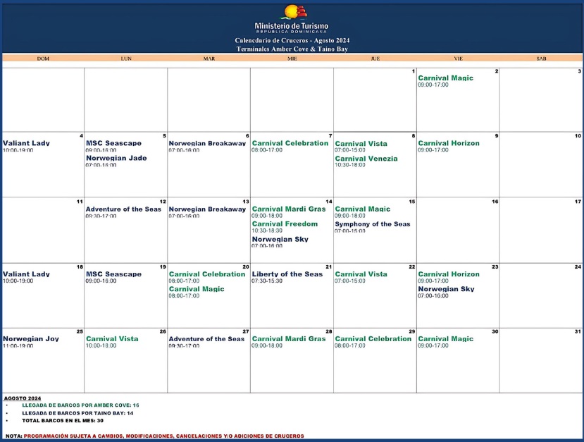 El director regional del Ministerio de Turismo en la zona Norte, Atahualpa Paulino, informó que alrededor de 30 barcos de cruceros llegarán a Puerto Plata, en el mes de agosto, de acuerdo a la programación de las navieras y los dos puertos que operan en la zona.