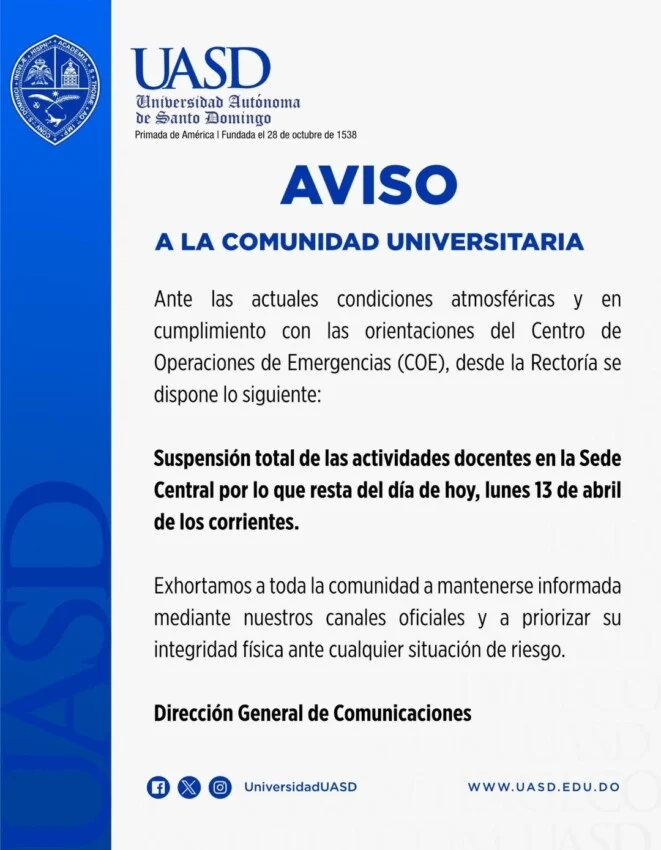 La Universidad Autónoma de Santo Domingo (UASD) dispuso la suspensión total de las actividades docentes en la Sede Central durante lo que resta de este lunes 13 de abril, debido a las condiciones atmosféricas adversas y en cumplimiento con las orientaciones del Centro de Operaciones de Emergencias (COE).